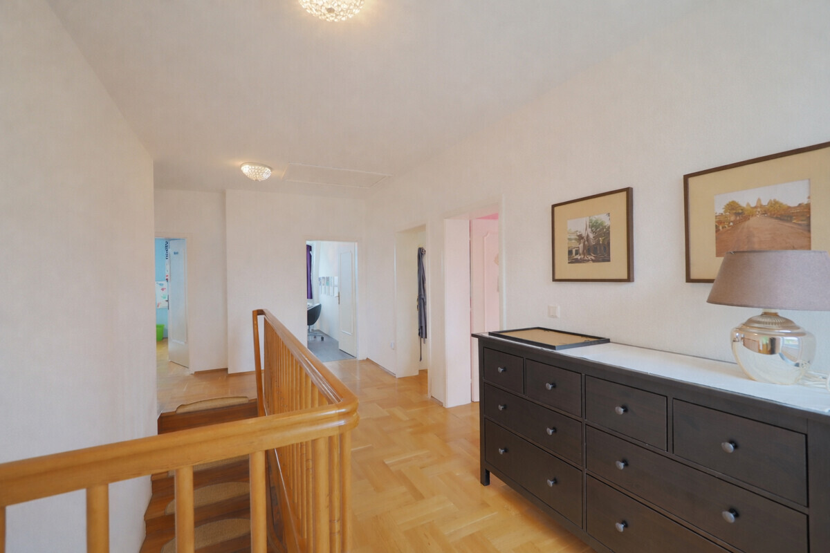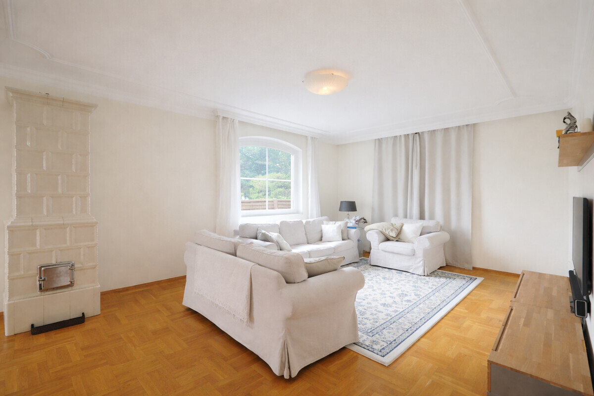 Die Villa bietet außergewöhnlich viel Platz für Familie, Gäste und Homeoffice. Große Fensterflächen sorgen für helle, freundliche Räume und einen harmonischen Bezug zum Garten. Hochwertiges Vollholzparkett, Fliesen mit Fußbodenheizung sowie klassische Radiatoren in den übrigen Bereichen schaffen ein angenehmes Wohnklima.