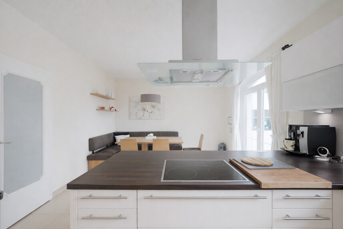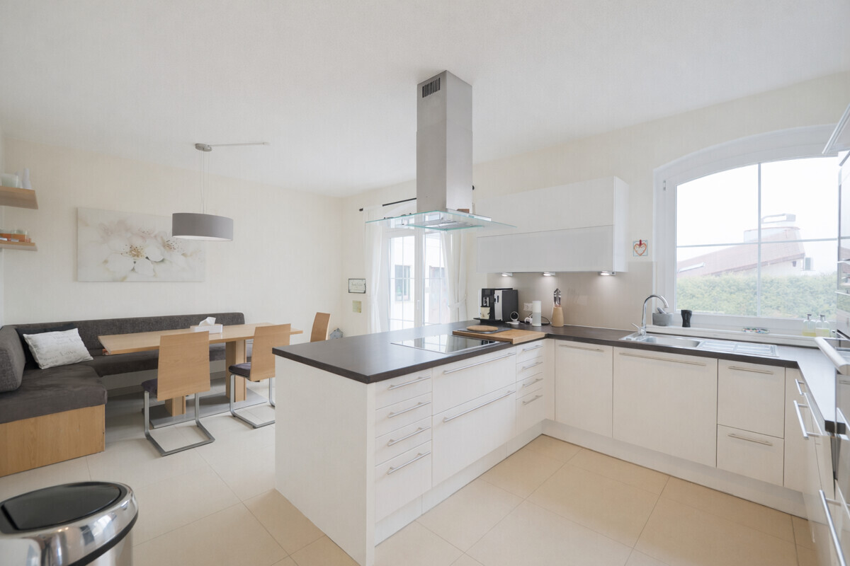 Die Küche sowie das Wohnzimmer verfügen über direkten Terrassenzugang – ideal für fließende Übergänge zwischen Innen- und Außenbereich. Zwei Badezimmer (EG mit Dusche, OG mit Wanne und Dusche) sowie zwei separate WCs unterstreichen den komfortablen Grundriss.